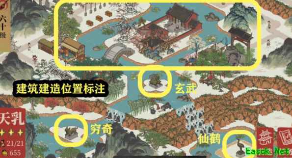 《江南百景图》玄武上游望仙鹤完成方法1、完成方法:【营造】-【剧情】建造一个玄武铜像、1个仙鹤神像、1个穷奇神像,摆放位置如图