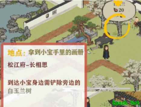 1.拿到小宝手中的画册,到达小宝身边与其对话,需先铲除旁边的白玉兰树 2.整理画图桌&家中的画,点击画图桌&陶然雅居进行整理获得画作 3.澄心堂纸&仙香,材料兑换→画室,采集白玉兰即可获得[玉兰花] 注:玉兰花掉率略低 4.清扫枯木,遇庙烧香,清扫挡路的枯枝即可前行,点击目标庙宇,消耗[仙香*1]完成烧香 注:枯枝无需全部清除,可以通行即可 5.收集古画,前往[书摊][古董摊]获得古画 6.鉴定古画,将获得的古画拿去[宝阁]鉴定,需鉴定出6幅真迹 注:古画数量不足时,可继续前往商摊处再次购买 7.扑灭着火的字画,扑灭地上的火堆,前往目的地 注:火堆反扑很快,需尽快通过,否则前进时消耗体力反复扑灭 以上就是《江南百景图》长相思主线剧情任务完成攻略,更多游戏攻略请持续关注手游网! 本文内容来源于互联网,如有侵权请联系删除。 |