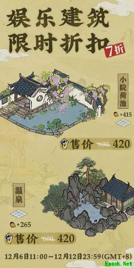 小院荷池价格介绍【价格介绍】 -【池光漾霞影】娱乐建筑打折活动开启; 【小院荷池】【温泉】开启限时优惠建造折扣。