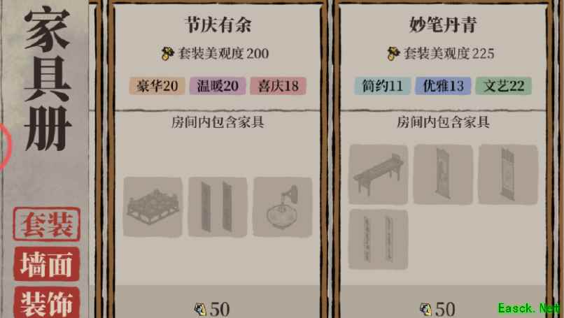 《江南百景图》妙笔丹青家具套装解锁方法【妙笔丹青家具】 1、妙笔丹青套装是:平头长案2级+高山流水图+迎春仕女画+书法对联,具体在右下角的印章那里有个家具册,可以查看 2、套装美观度225,简约11、优雅13、文艺22。解锁之后可以获得50补天石奖励 3、大家按照套装要求布置可以增加相应数值