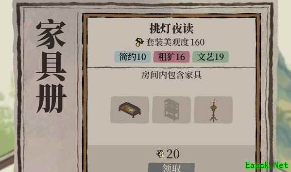 1、挑灯夜读家具套装,美观度160,简约10、粗犷16、文艺19。包含二级罗汉床、二级三层书架和原来就有的那个高脚烛台。 2、在游戏左边有个家具册,能看到套装。大家要按照要求摆放家具,注意书架和床要升级 3、完成之后可以领取20补天石 4、部分客人来访喜好为挑灯夜读家具套装,如苏轼 以上就是《江南百景图》挑灯夜读家具套装获取攻略,更多游戏攻略请持续关注手游网! 本文内容来源于互联网,如有侵权请联系删除。 |