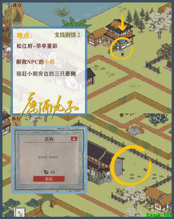 解救NPC的小鹅 驱赶小鹅旁边的三只恶狗即可解救成功 以上就是小编整理的江南百景图松江府探险华亭重彩支线剧情完成攻略的全部内容了,想知道更多相关资讯攻略的请关注手游网。 本文内容来源于互联网,如有侵权请联系删除。 |