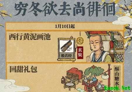 穷冬欲去尚徘徊活动介绍1月10日-1月19日 【西行黄泥画池】 天级居民【玄奘】概率提升。可消耗150黄泥直接兑换【玄奘】,并且可以抽取专属珍宝【般若经】。 1月10日-1月17日 回甜优惠礼包开放购买,内含小装饰【酥山糖水车】。 1月11日-1月17日 【太和公巡游记】活动开启 在城中找到太和公,提交食材烹饪东坡肉即可领取金画轴、补天石等丰富奖励。 1月13日-1月15日 【探秘桃花村】开启 1月14日-1月19日 【好米飘香广屯粮】 资源筹备活动开启,消耗资源制作木桶,储存菜肴。 【寒耕暑耘有收获】 升级助力活动开启,消耗资源兑换游戏经验,助力知府升级。