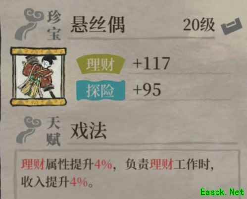 【双倍书籍】 天工开物、黄帝内经 【天赋:操纵】 负责理财工作时,有3/510%的几率立即完成本次生产,且所需额外工人-1/-2/不需要。 【珍宝推荐】 专珍:悬丝偶