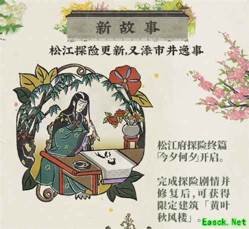 松江府探险终篇【今夕何夕】开启。 完成探险剧情并修复后,可获得限定建筑「黄叶秋风楼」。