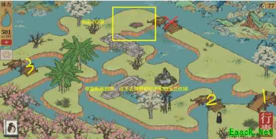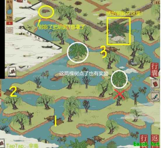 《江南百景图》松江探险今夕何夕通关攻略一些tips: 1.遇到断桥的时候,要注意有的是不能修复的,不想浪费资源的话记得按图示的标记走 2.有几棵枯树需要浇灌,浇灌之后可以获得仙豆、补天石,但要注意把枯树周围的荒废民宅都点一遍(点完可以获得泉水和铜钱以及补天石) 3.将主线任务都完成后再做隐藏任务,钥匙宝箱可以先看一下位置再开始探险,这样找的时候就比较快了 4.喜欢横屏玩探险的朋友记得在绘画时切换回竖屏,手机开启【自动旋转】即可 5.获取宝箱5时,需要去【阿又渔具店】买钓鱼竿,三种都要买完,前两次是普通鱼竿钓鱼,可以获取奖励,第三次才能钓到宝箱,走旁边的断桥到不了