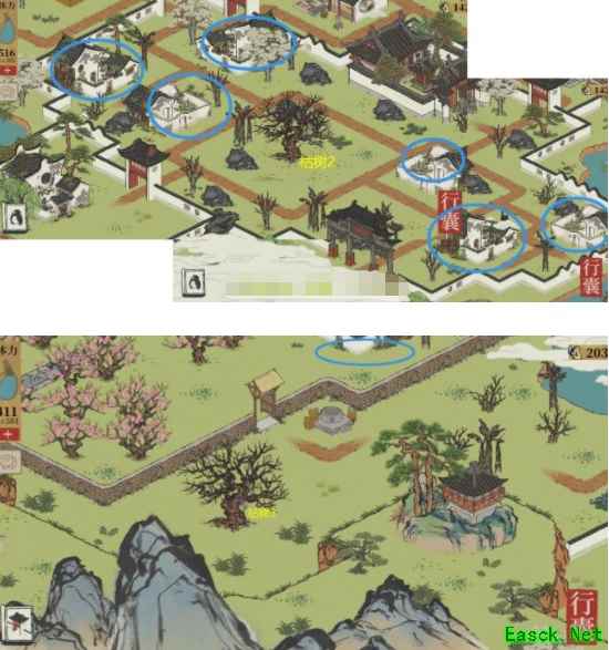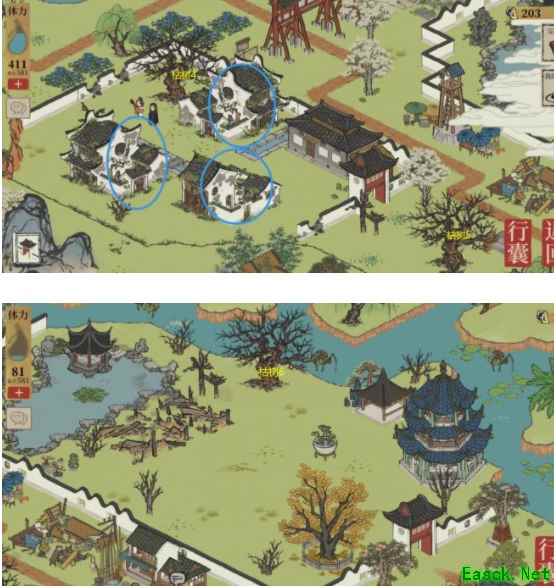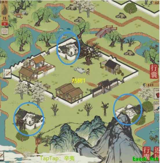 《江南百景图》今夕何夕枯树位置分享枯树1——垂须榕树:金仙豆×1、金画轴×1、补天石×15 枯树2——连香树:金仙豆×1、金画轴×1、补天石×15 枯树3——去年桃花:仙豆×1,补天石×10,铜钱×5888 枯树4——大柿子树:仙豆×1,补天石×10,铜钱×5888 枯树5——祈福仙树:仙豆×1,补天石×10,铜钱×5888 枯树6——最相思:仙豆×1,补天石×10,铜钱×5888 圈里的房子需要点击才能恢复枯树
