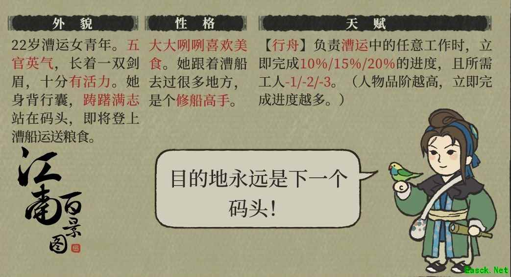 麦小满天赋介绍【天赋介绍】 【行舟】负责漕运中的任意工作时,立即完成10%/15%/20%的进度,且所需工人-1/-2/-3。(人物品阶越高,立即完成进度越多。) 【性格介绍】 大大咧咧喜欢美食。她跟着漕船去过很多地方,是个修船高手。