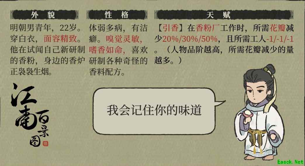 百里沉香天赋介绍【天赋介绍】 【引香】在香粉厂工作时,所需花瓣减少20%/30%/50%,且所需工人-1/-1/-1□。(人物品阶越高,所需花瓣减少的量越多。) 【性格介绍】 体弱多病,有洁癖。嗅觉灵敏,嗜香如命,喜欢研制各种奇怪的香料配方。