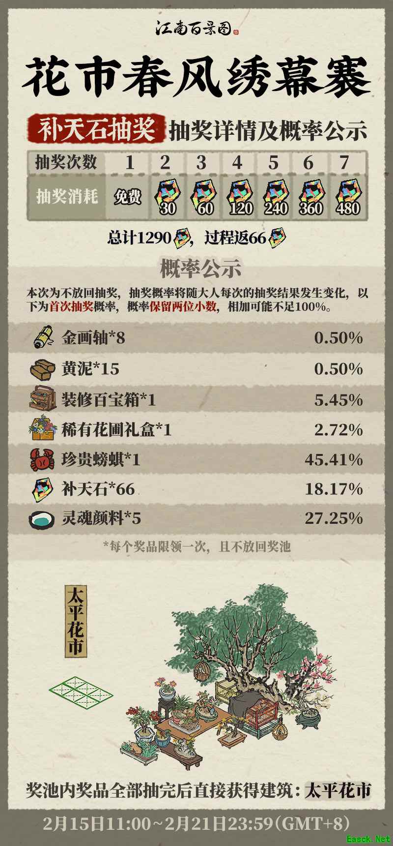 《江南百景图》累计消费补天石高收益攻略累消+抽奖活动补天石计算分析 补天石抽奖抽光奖池共计需1290石头,过程中返66,加上累消活动会返450,共计花774石头 然后随便花210个石头(自由支配),到累消1500,可以得到4×4的纳福幡会 210+774=984=灵魂颜料×5+红螃蟹×1+稀有花圃礼盒×1+装修百宝箱×1+黄泥×20+金画轴×8+纳福幡会(四格)×1+太平花市(六格)×1 总结:累消到1500性价比超高!