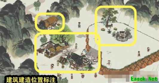 《江南百景图》氐宿下亢池通关攻略1.堵住山路口:营造-剧情建造1个茅草屋,建筑位置如图。 2.种柳树:营造一剧情建造1个柳树、铁匠铺。 3.布置听琴松:营造—剧情建造1个听琴松、金陵琴派,建筑位置如图。 4.杏花深处:营造一剧情建造1个杏花酒家,建筑位置如图。