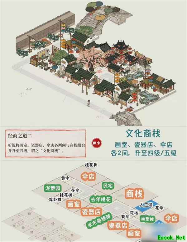 《江南百景图》文化商栈建造方法1、玩家可以在行囊里面找到经商之道二。 2、在这里会有文化商栈的建造方法记载。 3、首先玩家需要按照经商之道要求: 4、在商栈附近建造两个画室、两个瓷器店和两个伞店。 5、然后将这6个店铺升级到4级,这样就可以自动生成文化商栈。
