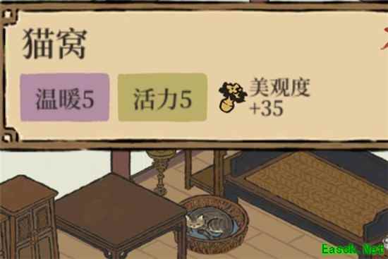 《江南百景图》猫窝使用方法1、猫窝可以放在知府宅邸当中,和家具装饰品作用一样。 2、使用方法和家具装饰品一样,选择合适的位置放置即可。 3、成功放置之后,会出现一个可爱的小猫咪躺在猫窝里。