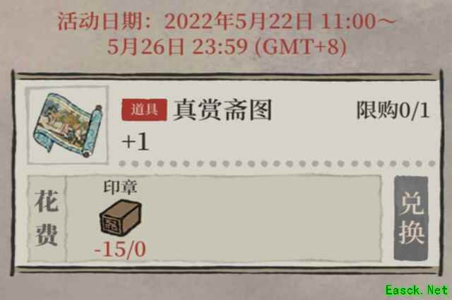 《江南百景图》印章作用介绍【作用介绍】 1、印章是江南百景图游戏中紫藤花系列活动的重要道具之一。 2、印章可以在画室寻真赏活动的兑换界面中兑换【真赏斋图】。 3、真赏斋图又是解锁文藤必不可少的一幅图,所以只要缺少了印章,活动就无法进行。 4、真赏斋图可以在【5月22日的11点至5月26日的23点59分】这个时间段内进行获取。