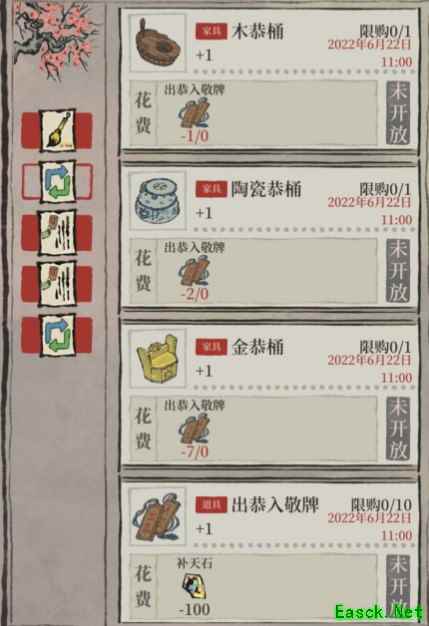 《江南百景图》出恭入敬有讲究玩法攻略1.活动时间 6.10-6.24 2.预计免费获得7个牌子、只够兑换金恭桶*1 3.第一关巧儿姐巡游记仅持续4天,提交材料完成任务可以获得出恭入敬牌 4.1个出恭入敬牌可以兑换木恭桶,1个木恭桶和2个出恭入敬牌可以兑换陶瓷恭桶,4个出恭入敬牌和1个陶瓷恭桶可以兑换金恭桶