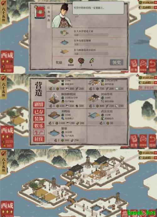 《江南百景图》鸡鸣山房宿玩法攻略1、根据提示走,繁荣度可以用已存的严大人带的,可以回收,不要自己建,浪费饭和人。 2、被子在“剧情”里面找,商业建筑位置,娱乐建筑位置和半山娘娘庙位置;商业建筑可以全部建家具铺节约时间,娱乐建筑可以建防火楼和牌坊。 3、建火把还是在“剧情”里,位置游戏已指定,修路,5个工厂在“生产”里建,可以建造纸厂和木板厂。