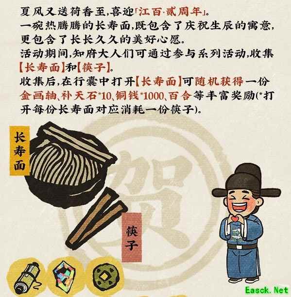 《江南百景图》长寿面获取方法1、周年庆签到(7.1-7.10) 第2/4/6天 共计1×3个 2、七月月签(7.1/3/4/5/7) 共计1×5个 3、寻找气泡居民(7.2-7.4) 共计2×3个 4、在线签到(7.6-7.8/7.22-7.24) 共计2×6个 5、补天石抽奖(7.8-7.14/7.22-7.28) 共计2×2个