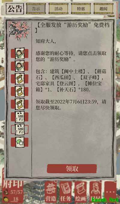《江南百景图》闽中土楼获取攻略新建筑闽中土楼是江南百景图最近开放的游历活动的相关奖励。 【全服发放“游历奖励”免费档】 知府大人,感谢您的耐心等待,请您点击领取您的“游历奖励”。