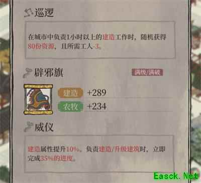 1.在城市中负责1小时以上的建造工作时,随机获得80份资源,且所需工人-3。 2.建造属性提升10%。负责建造/升级建筑时,立即完成35%的进度。 3.它的专属珍宝是辟邪旗,可以给建造增加289,农牧增加234 以上就是《江南百景图》江行天赋技能介绍,更多游戏攻略请持续关注手游网! 本文内容来源于互联网,如有侵权请联系删除。 |
