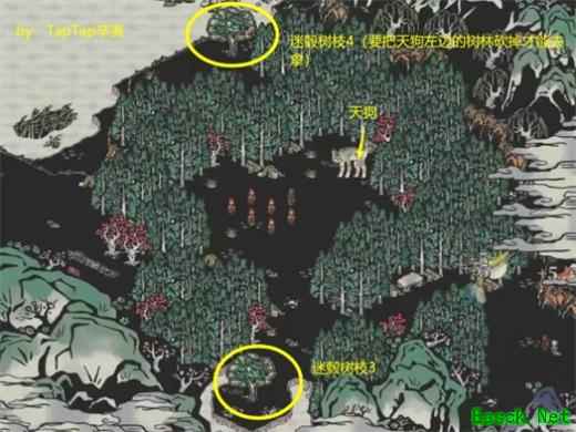 《江南百景图》陌上行迷枝位置一览1.第一个迷枝要把天狗坐边的树林砍掉才能拿。