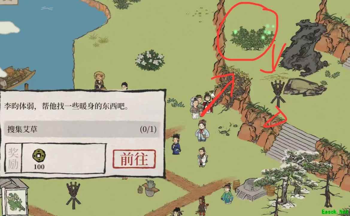 《江南百景图》歙县双鲤艾草位置一览图中艾草的位置,爬上藤条去采艾草