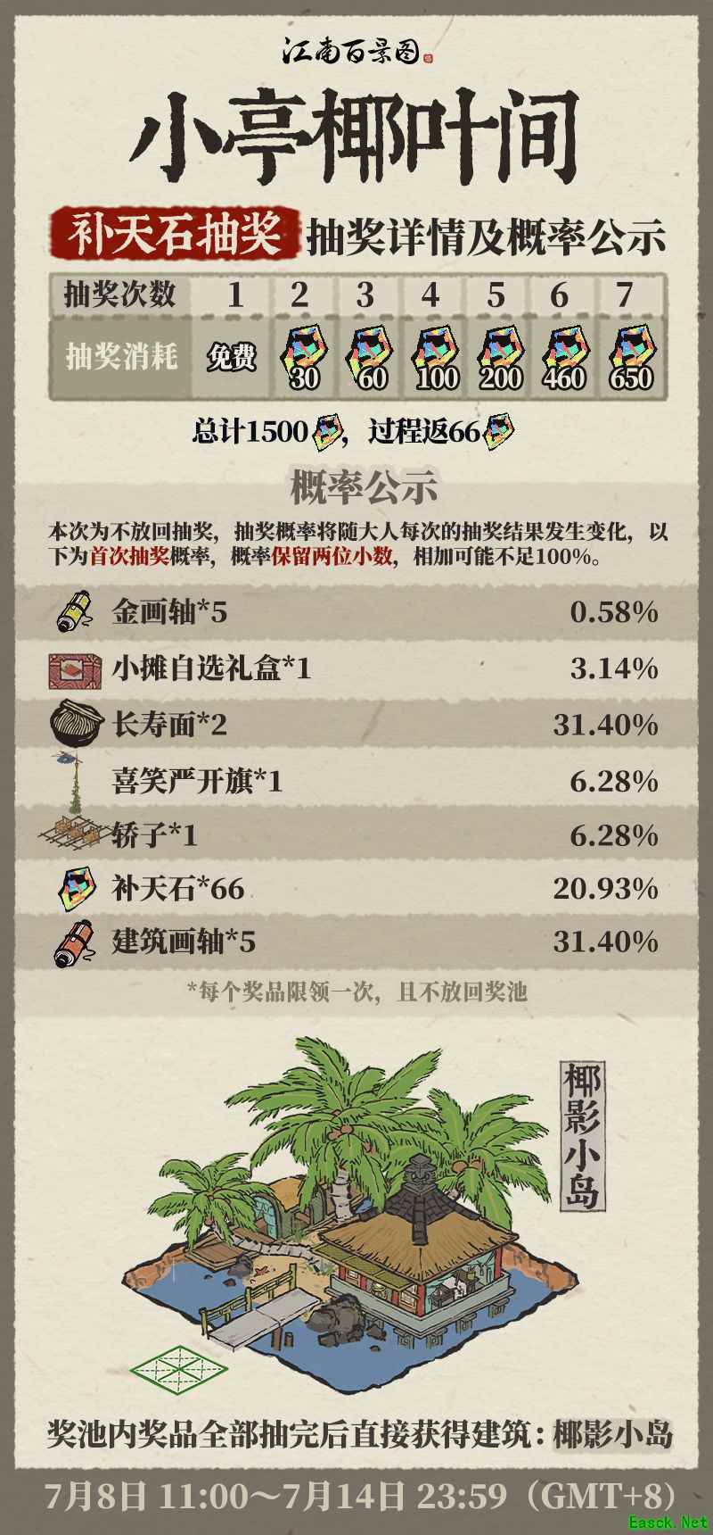 《江南百景图》小亭椰叶间补天石抽奖攻略「小亭椰叶间」补天石抽奖 「不一定要抽完,但一定要抽!」 「补天石×90有83.73%的概率换建筑画轴×5」 奖品按抽出概率从高到低排序: 并列第一(31.40%):建筑画轴×5 / 长寿面×2 第三(20.93%):补天石×66 并列第四( 6.28%):喜笑严开旗×1 / 轿子×1 第六( 3.14%):小摊自选礼盒×1 第七( 0.58%):金画轴×5 因此建议最多抽3次!稳赚不亏! 第1/2/3抽分别花费0/30/60补天石, 一般情况下,前3次即可获得: 建筑画轴×5 + 长寿面×2 + 补天石×66! 比如我,第1抽就出了建筑画轴,马上收手!