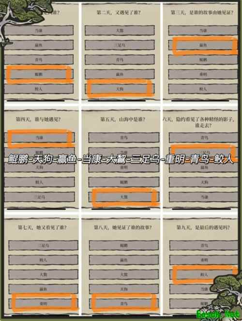 《江南百景图》聆听风的故事走出迷雾顺序攻略1.聆听风的故事走出迷雾顺序是鲲鹏,天狗,赢鱼,当康,大鵹,三足乌,重明,青鸟,鲛人,如下图: