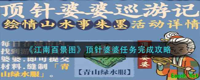 在江南百景图游戏中顶针婆婆是最近上线的活动npc,玩家每天都可以在顶针婆婆哪里完成缝制任务。任务还是比较简单的,玩家只需要提交一些竹叶就好。接下来就让小编给大家带来江南百景图顶针婆婆任务完成攻略,感兴趣的小伙伴们一起来看看吧。