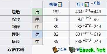 《江南百景图》姜寿培养攻略【人物属性】 初始属性:建造183,农牧18,制作39,理财82,探险39。 满级属性:建造443,农牧96,制作244,理财619,探险244。