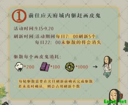 《江南百景图》画皮鬼驱逐方法驱逐方法: 1、活动时间:9月15日7:00~9月20日22:00; 2、玩家在【应天府】可以找到[5只画皮鬼]; 3、派遣负责人并消耗相应的资源,即可成功驱赶。 资源:棉花*200+布*100,铜钱*1000