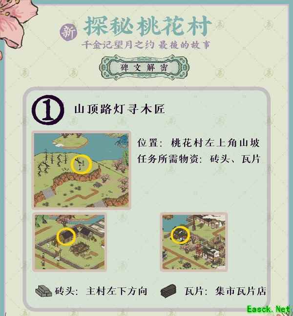 《江南百景图》探秘桃花村最后的故事通关攻略1.山顶路灯寻木匠 任务所需物资:砖头、瓦片