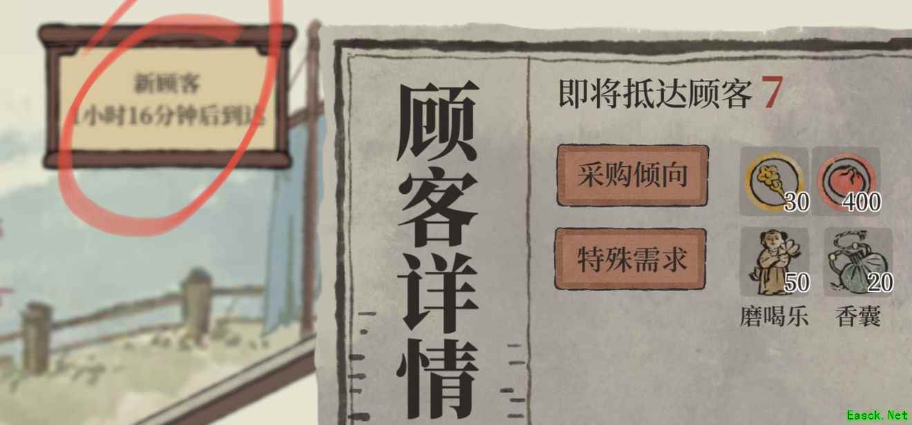 顾客需求:每次顾客访问时间会有倒计时,在商行的左上角可以看到,点击倒计时可以查看这波顾客的具体需求,对于货物匮乏和货架较少的前期来说,可以提前有针对性的生产和摆放货物,提高顾客满意度和收益。注意完美接待和不完美接待的收益差距巨大,特别是对于富商来说,尽量准备充分再点击接客。