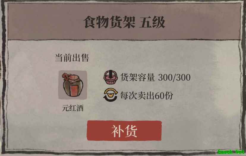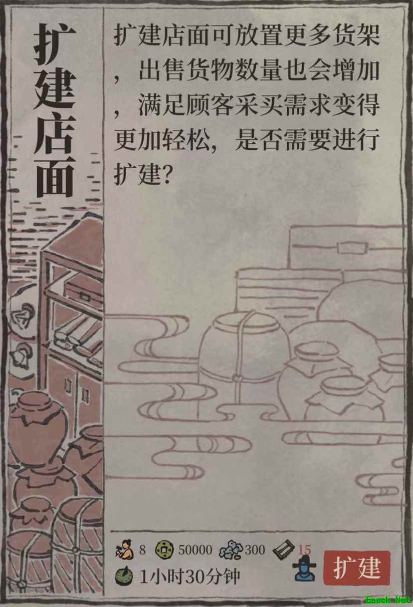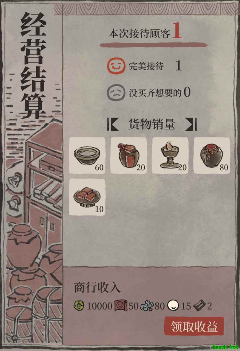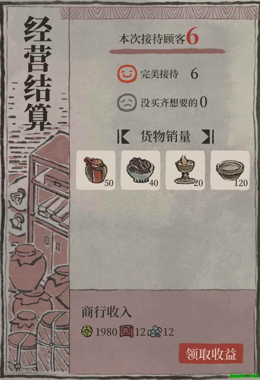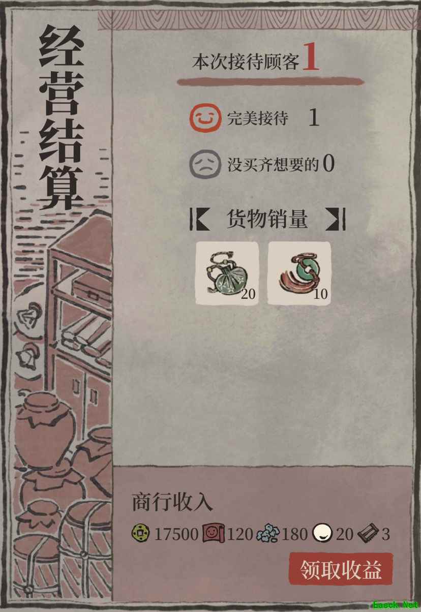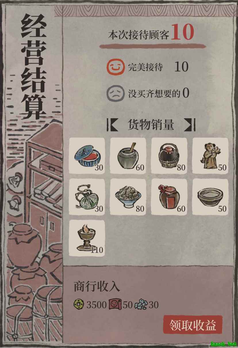 注意上图,第一行是顾客采购货物的种类需求,种类对就行,不作具体要求,这里的图标是饰品和食品,建议用饰品和食品里的一级货物满足即可。所以货架布局和补货的时候要特别注意,低级货物尽量保持在行动路线的前段,因为高级货物的原材料更难获取,这样可以节省制作资源和投入。第二行是顾客对于某一货物的明确需求,这个只要对应补货就可以了,放在行动路线的后半段。 10级口碑之前,顾客购物间隔1小时,每个普通顾客的收益是2点口碑和2个碎银,顾客人数为6人以下。