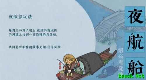 《江南百景图》夜航船玩法攻略活动时间 每周三、周六晚上七点至十二点期间 活动内容 在绍兴府城内可以找到乌篷船,点击即可乘着夜色出发,与同游的船客作伴赏景、听故事 故事听罢,请帮助船夫将乌篷船靠岸,他会为大人送上一份小礼物