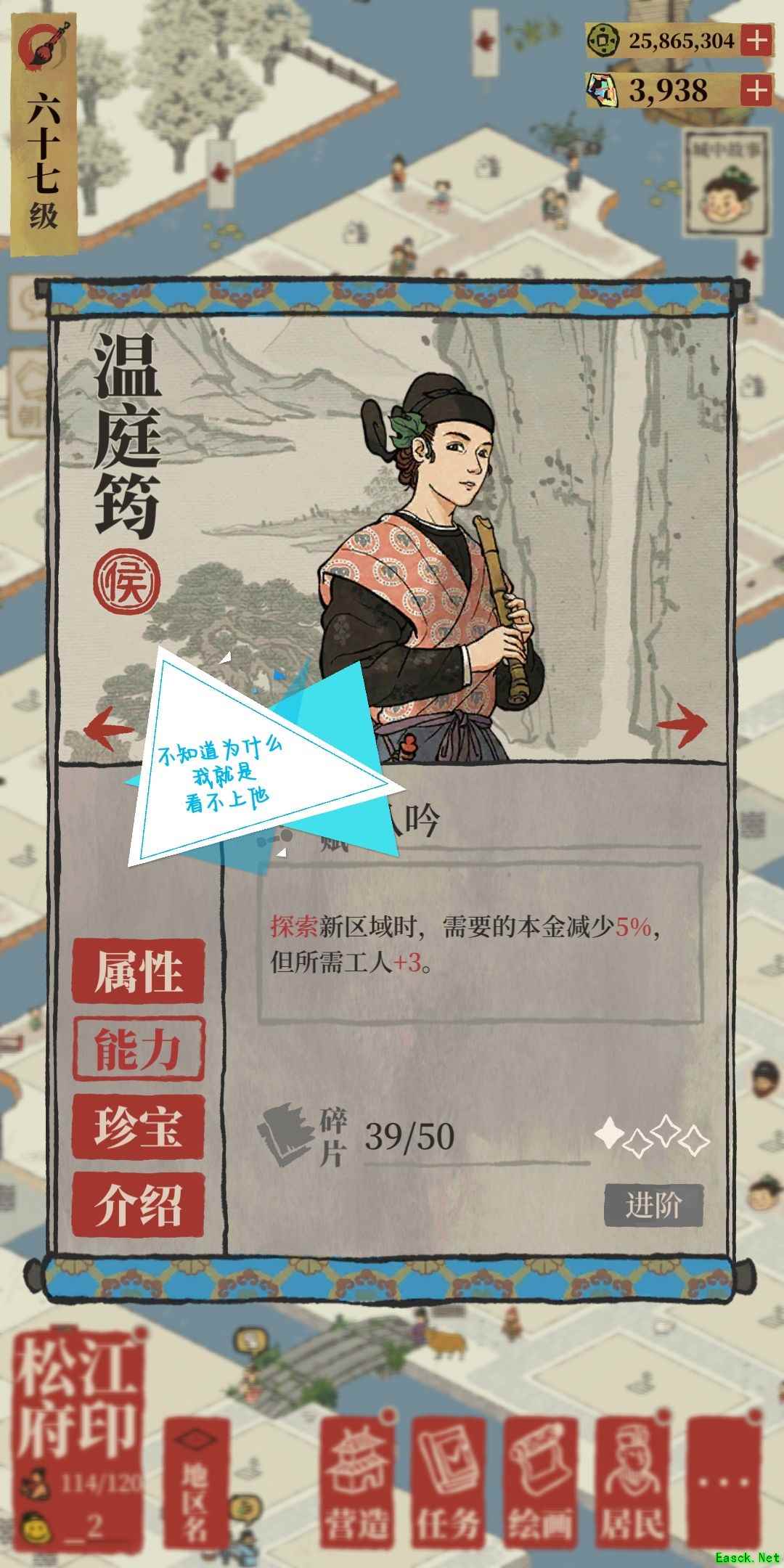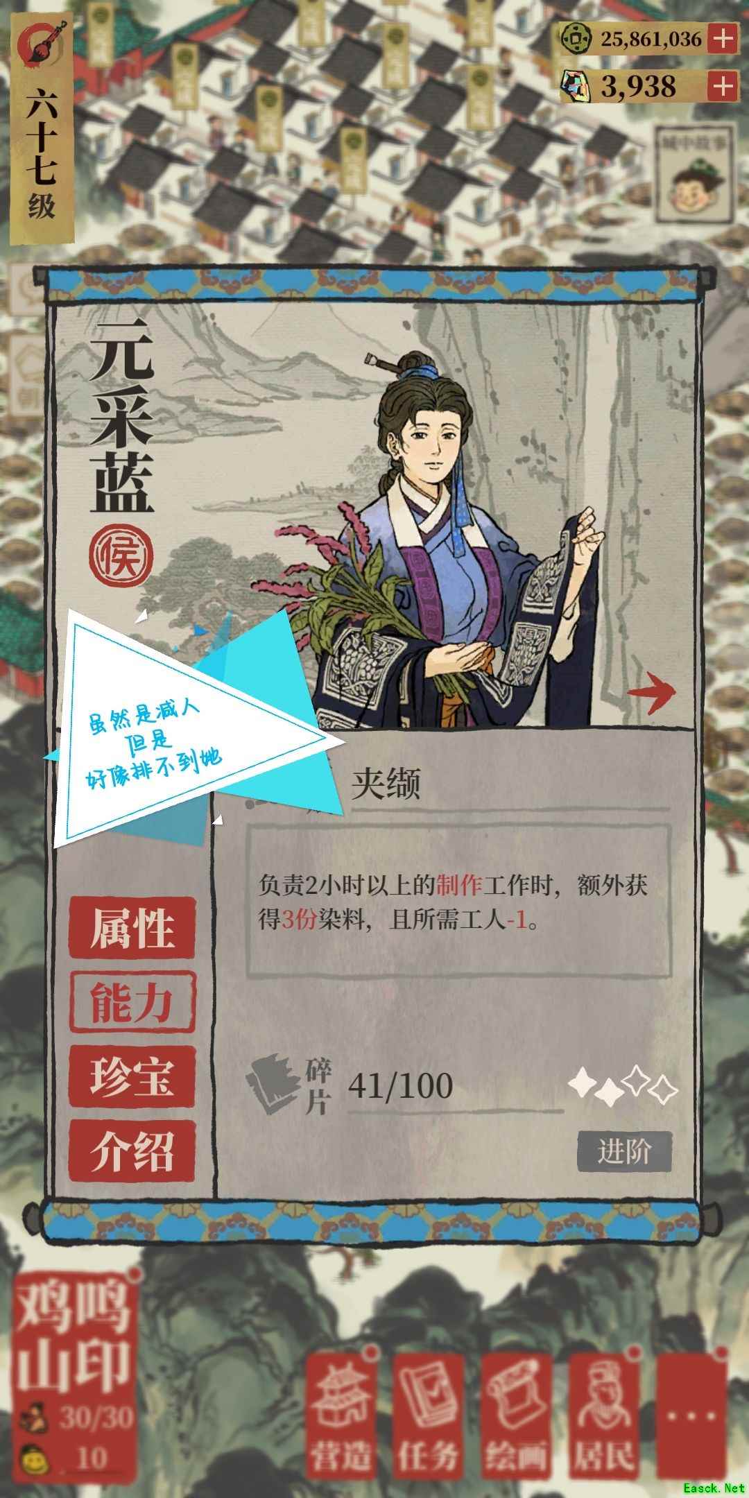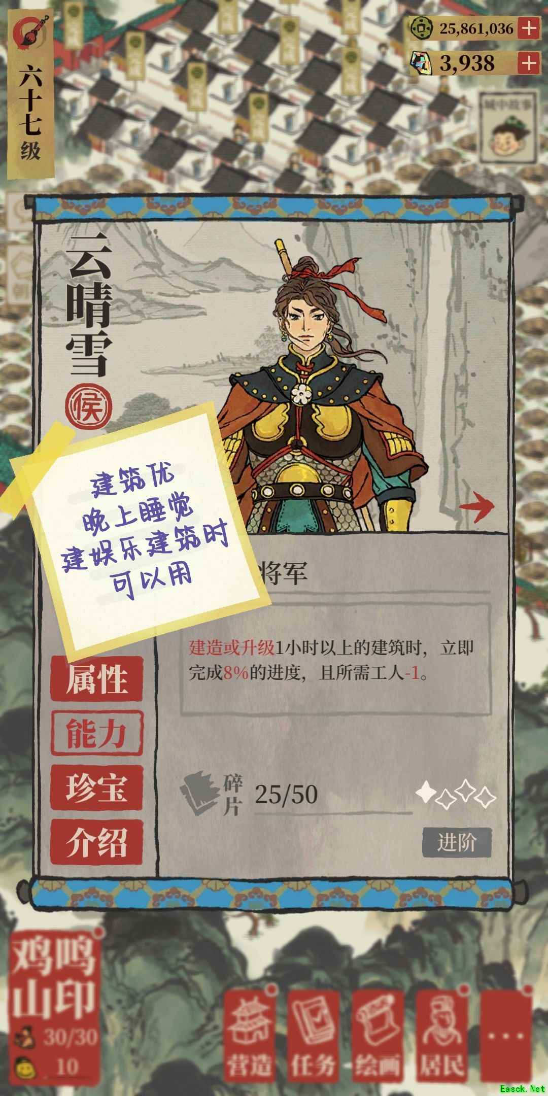 B.拿出一张纸和一支笔 在【有效加成】下,找出符合下列技能的特殊人物,专珍技能也算在里面: a.减人的 1.建造里除去【建造理财建筑】加成的所有建筑特优 2.减人的制作农牧特【轮不到优】 3.理财的不用 4.探险的后面说 b.减时间/减材料/生产加成 1.建造: 文征明减时间,要带; 吴黎轮不到,不带; 【减人】>【减材料】>【减时间】 2.制作农牧 【产物加成】>【减人】>【瞬间完成】 【沈括】除外,要带 3.理财 不带! 4.探险 固定1-2个【减时间】,1个【减铜钱】 ①刚进新城时 花费铜板不多时,用【减时间】的: 开地快,损失小 ②中段开始 用【减钱】的: 开的地已经有一定范围了,再开也就是锦上添花而已 两种情况最好优选【减人】的 C.对照玩的时间比较长的知府来说,这个时候,纸上也能有十多个人了,再添一点人,大约在15-20人,绝对够用了! (运人的安排在后面说) D.有几个侯很有意思 【云晴雪】(建筑优) 可以运过去遛弯,晚上换出来建娱乐建筑