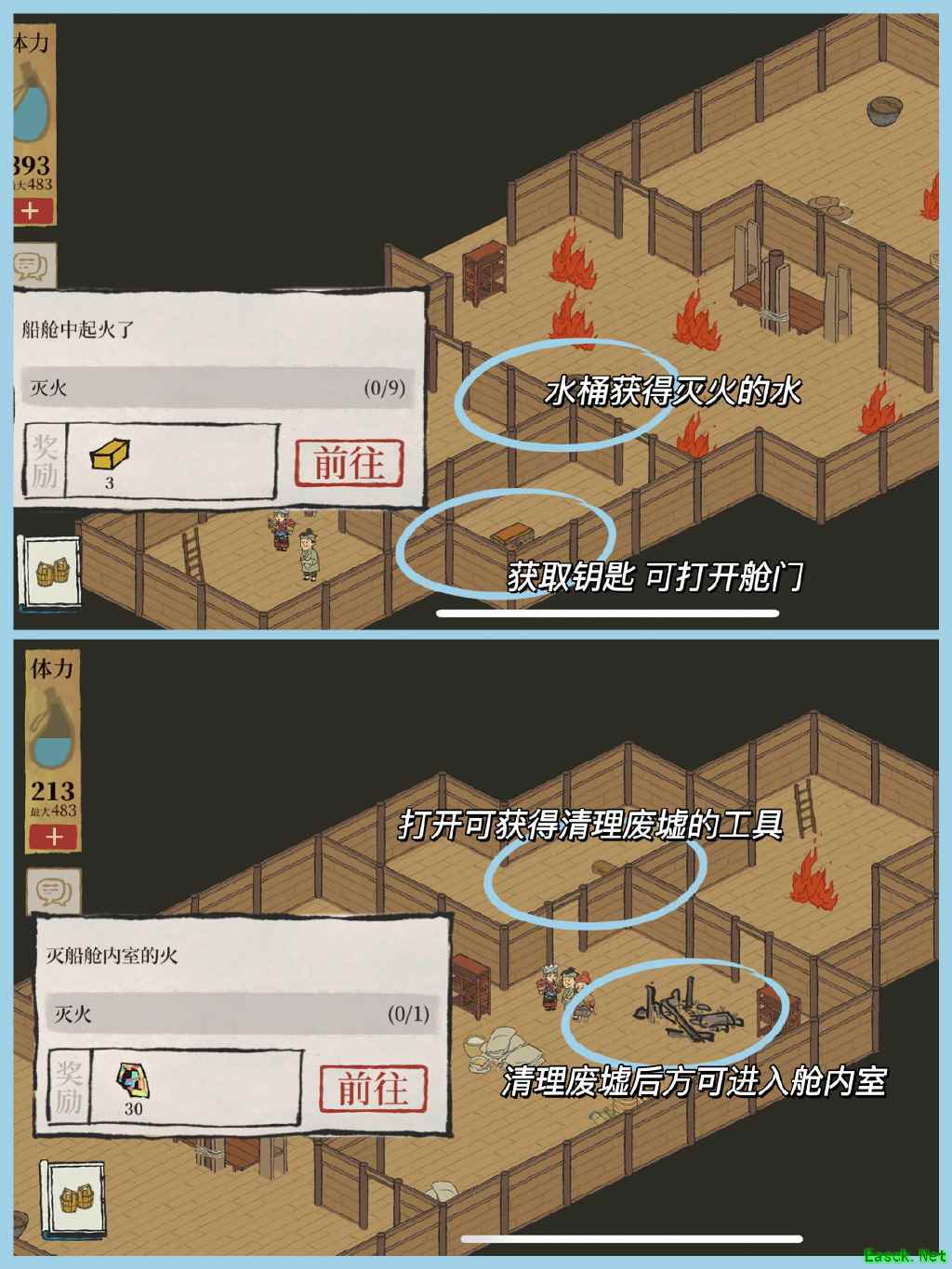 4、灭船舱室内火的顺序:找到藏钥匙的箱子获得钥匙→打开工具箱获得破坏废墟的工具→清理废墟→进入室内灭火