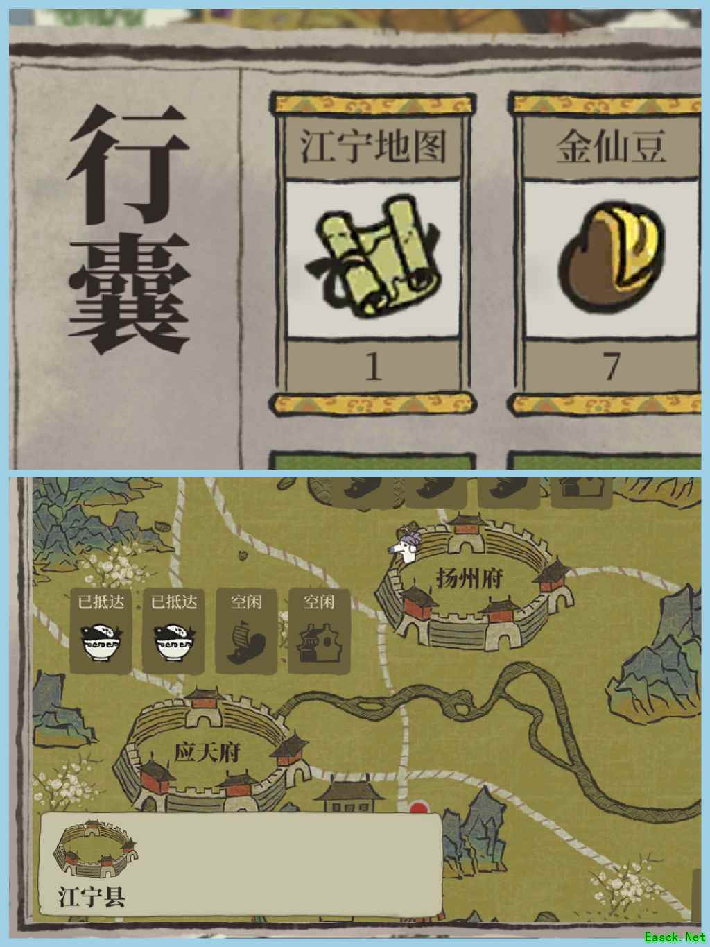 《江南百景图》江宁县触发方法:1、应天府任务交1000云锦 2、任务完成之后会给你一张地图 3、然后去行囊里找到地图点击前往就行了