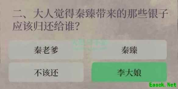 二、第二题 1、题目:大人觉得秦臻带来的那些银子应该归还给谁? 2、答案:第四个选项,李大娘。