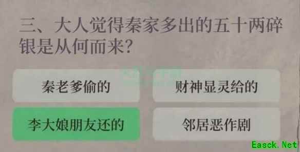 三、第三题 1、题目:大人觉得秦家多出的五十两碎银是从何而来? 2、答案:第三个选项,李大娘朋友还的。