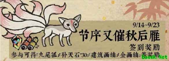3、节序又催秋后雁 签到可获得九尾狐、补天石建筑画轴、金画轴等奖励。