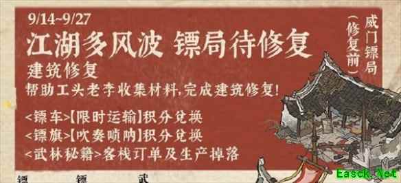 4、建筑修复 帮助工头老李完成建筑修复,掉落武林秘籍、镖车和镖旗。