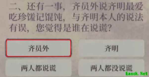 2.还有一事,齐员外说齐明最爱吃珍馐记馄饨,与齐明本人的说法有误,您觉得是谁在说谎? 答:齐员外