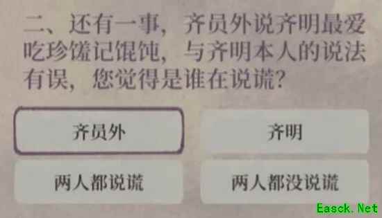 二、还有一事,齐员外说齐明最爱吃珍馐记馄饨,与齐明本人的说法有误,您觉得是谁在说谎? 选项:齐员外、齐明、两人都说谎、两人都没说谎 答案:齐员外