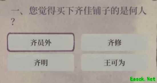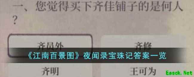 《江南百景图》夜闻录宝珠记答案一览一、您觉得买下齐佳铺子的是何人? 选项:齐员外、齐修、齐明、王可为 答案:齐员外