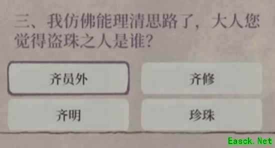 三、我仿佛能理清思路了,大人您觉得盗珠之人是谁? 选项:齐员外、齐修、齐明、珍珠 答案:齐员外