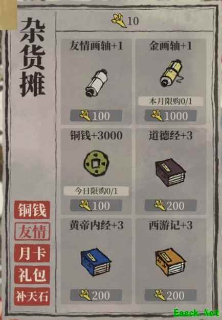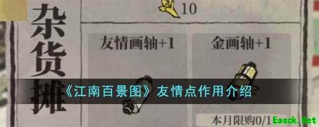 《江南百景图》友情点作用介绍友情点作用介绍 1、友情点是游戏中的一种货币,可以用来兑换指定的道具。 2、友情点可以在杂货铺兑换相关物品,其中小编推荐限购的金画轴和3000铜钱必买,其他的根据玩家心仪的选购就好。