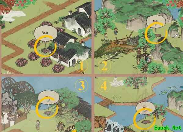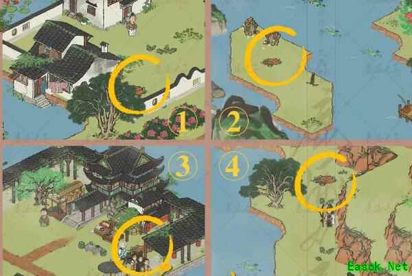钥匙位置 1、钥匙一在院子的角落里。 2、钥匙二在小岛的上面。 3、钥匙三在庭院的亭子下面。 4、钥匙四在河边的小树旁。