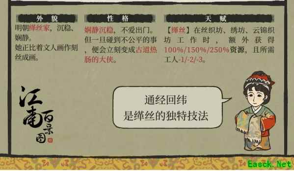 二、天赋介绍 1、该角色的天赋适合发展织布行业的玩家,可以减少工人数量。 2、在丝织坊、绣坊以及云锦织工作,可以增加资源。 以上就是小编整理带来的《江南百景图》鹿经纬介绍一览攻略,更多相关游戏攻略,请关注手游网! 本文内容来源于互联网,如有侵权请联系删除。 |