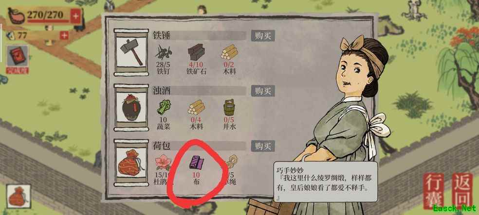 《江南百景图》探险布料获取方法一览布不是探险地图中获得的,是要在织布坊中自己生产出来的。 1、首先回到主城应天府,在营造-生产,找到织布坊; 2、建造好了织布坊就可以生产布匹了; 3、建造织布坊需要两个工人、300铜币、170食物以及160棉花。