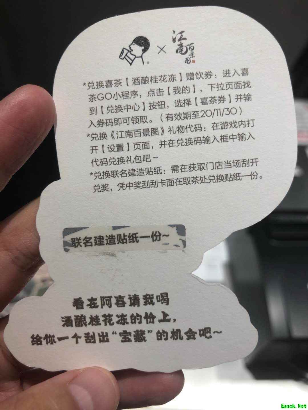 《江南百景图》酒酿桂花冻获取方法介绍在喜茶实体店,购买喜茶新品酒酿桂花冻,得到刮刮卡,刮奖有几率得到奖励。 注:两杯一个刮刮卡,有的店员可能会多送。